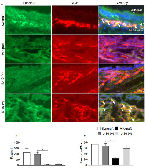 IL-10 is sufficient to promote vascular endothelial expression of Fascin-1. (A,B) Immunofluorescence staining and semi-quantitative analysis of graft expression of Fascin-1 on CD31+ vascular endothelial cells at d10 post-transplantation. (C) Quantitative RT-PCR analysis of grafts shows fold change in mRNA of Fascin-1 at d10 post-transplantation. White arrows highlight Fascin-1/CD31 coexpression in the subepithelial region. Data are presented as means with SE of 12 transplants/time point/experiment. * p < 0.05. Original magnification, ×40.