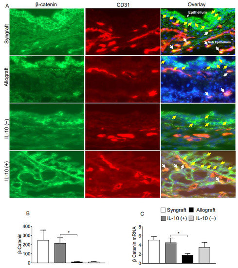 IL-10 is sufficient to promote vascular endothelial expression of β-catenin. (A,B) Immunofluorescence staining and semi-quantitative analysis of graft expression of β-catenin on CD31+ vascular endothelial cells at d10 post-transplantation (C) Quantitative RT-PCR analysis of grafts show fold change in mRNA of Fascin-1 at d10 post-transplantation. Yellow arrows highlight the β-catenin expression on the epithelial layer, and white arrows highlight β-catenin expression on CD31+ vascular endothelial cells. Yellow arrows highlight β-catenin expression in the epithelial, and white arrows highlight β-catenin/CD31 coexpression in subepithelial region. Data are presented as means with SE of 12 transplants/time point/experiment. * p < 0.05. Original magnification, ×40.