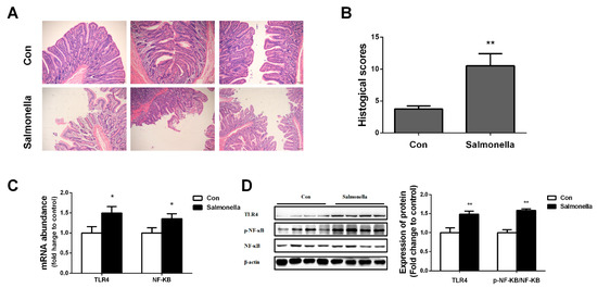 Histological analysis revealed that Salmonella-challenged pigs demonstrated more ileal villi fracture, epithelial detachment, and increased infiltration of inflammatory cells in the mucosal layer of ileum compared with control group pigs (Figure 1A,B). In addition, we also observed that challenging Salmonella significantly enhanced the mRNA expressions of TLR4 and NF-ΚB (Figure 1C); protein expressions of TLR4 and p-NF-ΚB/NF-ΚB were also higher in the Salmonella infection group compared with the control group (Figure 1D).