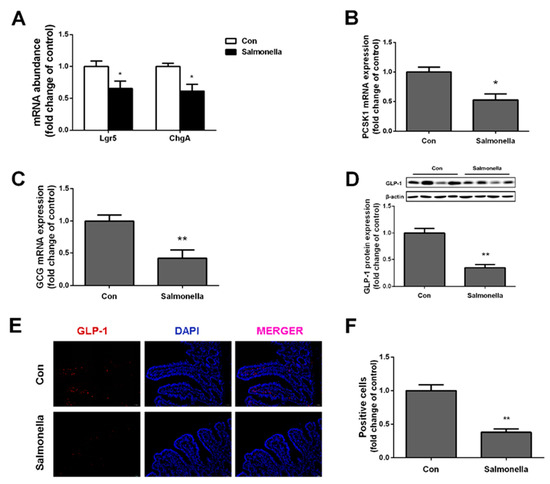 We analyzed the expressions of leucine-rich repeat-containing G protein coupled receptor (Lgr5) and chromogranin A (ChgA); they represent stem cells responsible for the ongoing renewal of intestinal epithelium and endocrine cells, respectively. It was shown that Lgr5 and ChgA expressions were markedly decreased in the Salmonella infection group (Figure 2A). In the ilea of pigs treated with Salmonella, we found significant reductions of proprotein convertase subtilisin/kexin type 1 (PCSK1) and preproglucagon (GCG) gene expressions (Figure 2B,C), which are, respectively, responsible for post-translational processing of proglucagon and encoding the protein of GLP-1. Western blotting results revealed that Salmonella treatment significantly decreased protein expressions of GLP-1 (Figure 2D). Consistently, immunofluorescence staining analysis revealed that the secretion of GLP-1 was dramatically reduced in the Salmonella treatment group compared with the control group pigs (Figure 2E,F).