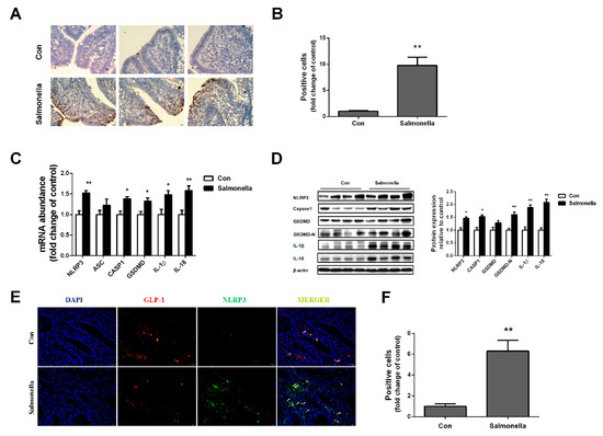 TUNEL examination was performed, as shown in Figure 3A,B. Compared with the control group, Salmonella treatment significantly increased the number of positive cells in the ileum. Then, we examined mRNA and protein levels of pyroptosis-related genes in ilea. As shown in Figure 3C, mRNA levels of NLRP3, CASPASE1, GSDMD, IL-1β, and IL-18 were dramatically up-regulated in the Salmonella-treated group when compared with the control group, although no significant difference was observed in ASC mRNA expression. Accordingly, Western blotting analysis revealed that the protein expressions of NLRP3, CASPASE1, GSDMD-N, IL-1β, and IL-18 were higher in ilea of the Salmonella treatment group than the control group (Figure 3D). To further explore whether Salmonella treatment induced pyroptosis of L cells in the ileum, we labeled L cells using both GLP-1 and NLRP3 fluorescent antibodies. After Salmonella treatment, the luciferase activity of GLP-1 significantly decreased, while NLRP3 luciferase activity significantly increased (Figure 3E,F).