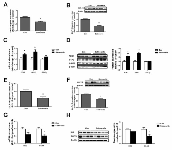 Effects of Salmonella on GLP-1R and glucose metabolism in liver and muscle. (A,B) genes and protein expression of GLP-1R in liver; (C,D) genes and protein expression of gluconeogenesis in liver; (E,F) genes and protein expression of GLP-1R in LGD; (G,H) genes and protein expression of glycolysis in LGD. LGD—longissimus dorsi. Values are mean ± SEM. n = 4/group. (*) means p < 0.05, (**) means p < 0.01.