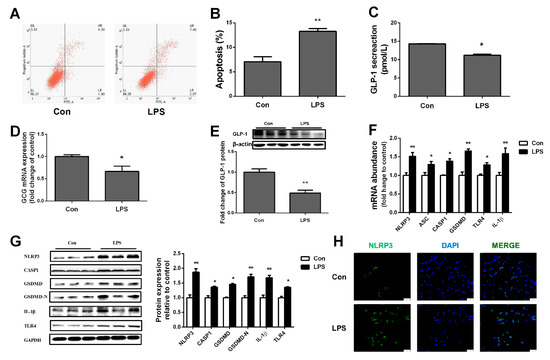LPS inhibited production of GLP-1 by inducing pyroptosis in STC-1 cells. STC-1 cells were treated with LPS for 24 h. (A,B) apoptosis of STC-1 cells in control and LPS group was detected by flow cytometry assay; (C) GLP-1 content in STC-1 cells; (D) proglucagon mRNA expression; (E) protein expression of GLP-1; (F,G) pyroptosis-related genes and protein expression in STC-1 cells; (H) ileum immunohistochemistry (10×). Values are mean ± SEM. n = 3/group. (*) means p < 0.05, (**) means p < 0.01.