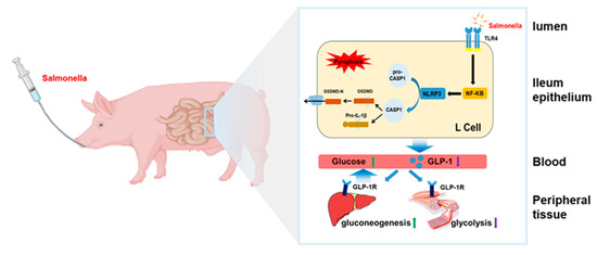 Therefore, in the present study, piglets exposed to intestinal Salmonella infection were employed. This study aimed to investigate whether Salmonella infection impairs the secretion of GLP-1 by enteroendocrine L cells and what the possible underlying mechanism involved is. The results will help to clarify glucose metabolism disorders induced by environmental Salmonella infection and shed new light on immunometabolism research.