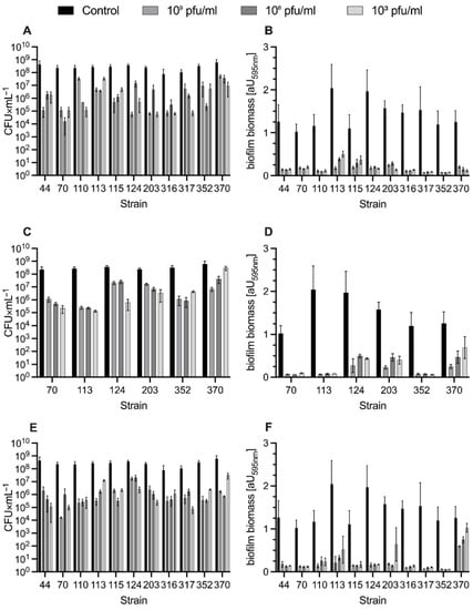 Antibiofilm activity of phages vB_SauM-A (A,B), vB_SauM-C (C,D), and vB_SauM-D (E,F). Effects of phages on the number of viable cells (A,C,E) and biomass reduction (B,D,F).
