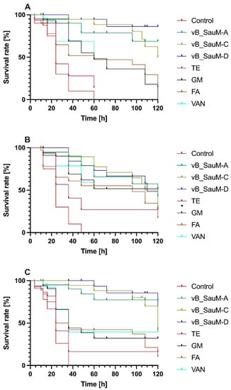 Larvae of Galleria mellonella characterized with cream color and weight of 300 mg were chosen for the experiments. The procedure of the in vivo test was performed based on Szymczak et al. (2020) [24]. Firstly, G. mellonella larvae were infected with proper strain of S. aureus (approx. 105 CFU/mL) into the larval hemolymph behind the last proleg. Then, after 20 min of incubation at room temperature, larvae were subjected to the curation with one of the antibiotics (gentamicin, fusidic acid, tetracycline, or vancomycin) or one of the phages (vB_SauM-A, vB_SauM-C, or vB_SauM-D). The concentration of antibiotics was equal to MIC value and was calculated based on the average weight of larvae, and suspension of bacteriophages was at MOI = 1. The injection was made on the opposite side to the bacterial injection. Larvae were incubated at 37 °C and examined every 12 h. Larvae that exhibited dark color and did not respond to physical contact were considered dead. Untreated larvae were considered a control group.