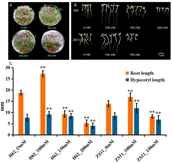 The germination and seedlings grow of two rapeseed varieties (H62 and ZS11) under different NaCl concentrations (0, 100, 150 and 200 mM) on the eighth day. (A) Comparison of germination of H62 and ZS11 under different salt concentrations; (B) Comparison of early seedlings of H62 and ZS11 under different salt concentrations; (C) Hypocotyl length and root length of early seedlings of H62 and ZS11 at different salt concentrations. ** indicates that the root length and hypocotyl length of each variety (H62 and ZS11) under salt stress were significantly different from those of the control condition at p < 0.01 (Student’s t test).