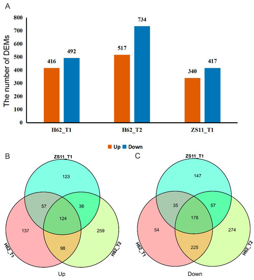 Conditions for screening differentially expressed metabolites (DEMs): (1) VIP ≥ 1; (2) Fold-change ≥ 1.2 or Fold-change ≤ 0.833; (3) q-value < 0.05. 912, 1251, and 757 differentially expressed metabolites (DEMs) were detected in three groups (H62_T1 vs. H62_CK, H62_T2 vs. H62_CK and ZS11_T1 vs. ZS11_CK), respectively, and most DEMs were uniquely associated with a specific salt treatment (Figure 2A). For example, compared with H62_CK, 196 and 295 DEMs were only specifically up-regulated in H62_T1 and H62_T2, respectively, and 222 DEMs were up-regulated in both H62_T1 and H62_T2. Considering the common DEMs in H62_T1, H62_T2, and ZS11_T1, 124 and 178 DEMs were up-regulated and down-regulated in all the salt treatment including H62_T1, H62_T2 and ZS11_T1, respectively, and these DEMs were considered as the salt-related metabolites in rapeseed (Figure 2B,C). The enrichment analysis of the KEGG pathway showed that most of the DEMs were mainly enriched in metabolic pathways, and the biosynthesis of secondary metabolites (Table S2).