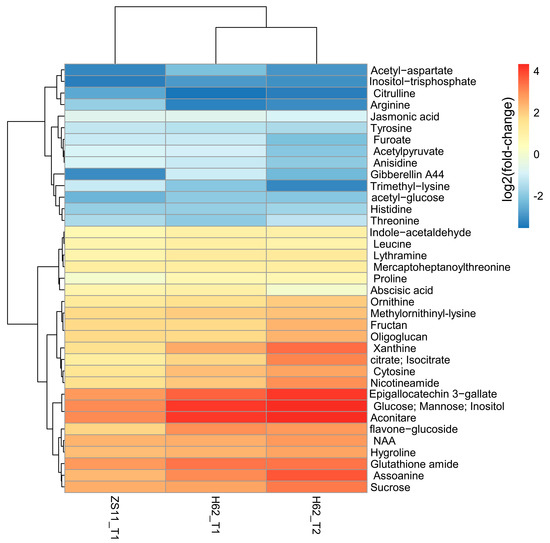 Combining the pathway function enrichment analysis results, the result of DEMs annotation, and the fold-change levels of the two varieties under different salt concentrations, 103 DEMs were screened out (Table S3), and some DEMs are listed in Figure 3. These DEMs can be divided into several categories. The first group is amino acid, including Proline, Arginine, Ornithine, Leucine, Threonine, Aspartate, and Hygroline. Except for Proline, Ornithine, and Hygroline, which were highly induced by salt stress, the content of other amino acids was significantly down-regulated, suggesting that salt stress could inhibit the normal metabolic process of amino acids in rapeseed. The second group was carbohydrate, including Glucose, Fructan, Inositol, Sucrose, Mannose, and Oligoglucan; most of these were up-regulated by salt stress in two rapeseed. The third group was plant hormone, including ABA, NAA, GA, and JA. NAA was up-regulated and ABA, and GA and JA were down-regulated in H62_T1, H62_T2, and ZS11_T1. Several important metabolic intermediates in the TCA cycle were all up-regulated, such as Citrate, Aconitare, and Isocitrate, indicating that rapeseed cloud enhances its energy metabolism pathway under salt stress.