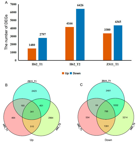 The differentially expressed genes (DEGs) among the groups for H62 and ZS11 under salt stress (T) and normal (C) conditions at different NaCl concentrations (T1, 150 mM, T2, 200 mM). (A) The number of DEGs in three groups. (B) Venn diagram of up-regulated DEGs in three groups. (C) Venn diagram of down-regulated DEGs in three groups.