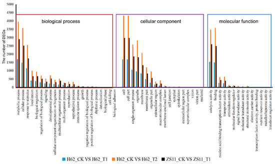 Adjust p-value ≤ 0.05 and a |log2FoldChange| ≥ 1 were set as the thresholds to determine the significance of the gene-expression difference between samples. Compared with H62_CK, there were 4277 (Up 1480 and Down 2797) and 10,592 (Up 4166 and Down 6426) DEGs at the treatments of H62_T1 and H62_T2, displaying a rising tendency in DEGs numbers. Compared with ZS11_CK, there were 7745 (Up 3380 and Down 4365) DEGs at the treatments of ZS11_T1 (Figure 4A). Down-regulated genes had greater numbers than those of the up-regulated ones, H62 and ZS11, under different NaCl concentrations. Comparing the number of DEGs of H62 and ZS11 under two salt-concentration conditions, the number of DEGs of H62_T2 and ZS11_T1 were significantly higher than that of H62_T2, providing evidence of gene transcription level for the difference in salt tolerance between H62 and ZS11.