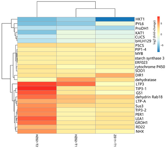 The heat map of the part of DEMs related to salt stress base on the log2Foldchange among the groups for H62 and ZS11 under salt stress (T) and normal (C) conditions at different NaCl concentrations (T1, 150 mM, T2, 200 mM).