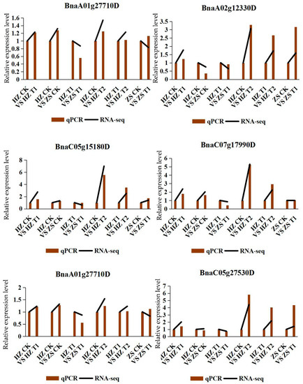 In order to validate the reliability of our RNA-seq data, we measured mRNA abundance using qRT-PCR for 6 DEGs. All the six tested genes by qRT-PCR were significantly changed between H62 and ZS11 rapeseed under the different NaCl treatments, which was similar to the result observed through RNA-seq analysis (Figure 8). Although the change folds were not exactly the same as those revealed by the transcriptome-profiling data, all the validated genes showed similar expression patterns considering the DEGs data.