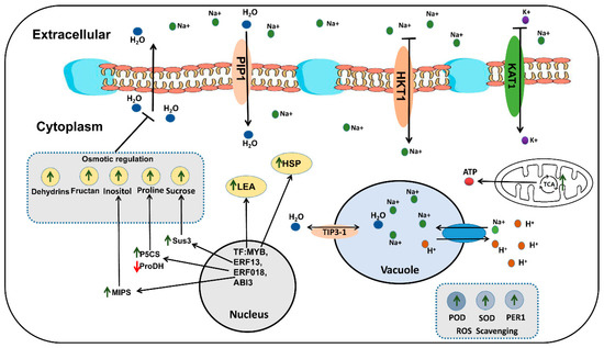 Based on the data results of the correlation analysis of key DEMs and DEGs (Figure S5), some putative mechanisms of rapeseed salt tolerance were (Figure 10): (1) High concentrations of NaCl in the environment decreased the water potential, which made it difficult for the plant cells to absorb external water. In order to reduce the harm of osmotic stress, the genes related to osmotic regulation in rapeseed is regulated by related transcription factors (MYB, ERF, bHLH) in the nucleus. Salt stress can promote the TCA cycle of rapeseed and produce more ATP for rapeseed metabolic activity. The up-regulation of P5CS and down-regulation of ProDH increased proline synthesis, the up-regulation of Sus3 and MIPs increased Sucrose and Inositol synthesis, and macromolecular proteins, such as LEA, Dehydrins, began to accumulate in large quantities, which could balance the water potential inside and outside the cells to some extent. In addition, the PIP protein located on the cell membrane and the TIP protein located on the vacuole membrane can also regulate the water balance in the cell and the vacuole. (2) High concentrations of Na+ inhibit the activity of KAT1, thereby inhibiting the absorption of K+. A large amount of Na+ enters the cells, and then causes ion toxicity in the cells. The down-regulation of HKT1 can limit the absorption of Na+ by the cell membrane, and the up-regulation of NHXs can force cells to transport more Na+ into the vacuole to reduce ion toxicity. (3) Large amounts of ROS were generated in cells under salt stress, which may cause oxidative damage to cells. The ROS scavenging system may neutralize the excess ROS. The up-regulation of the ROS scavenging system-related genes (such as POD, SOD, and PER1) decreased ROS content in the cell to reduce its damage to the cell. In addition, the enhanced TCA cycle provides energy for gene transcription, translation, and substance synthesis under salt stress. The functional genes mentioned above need further functional verification.
