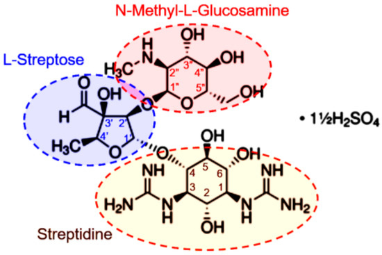 Streptomycin (STR) is the oldest broad-spectrum antibiotic (i.e., known since 1940) used in the treatment of bacterial infections, such as tuberculosis caused by Mycobacterium tuberculosis [24,25]. Streptomycin is a prototype of aminoglycoside antibiotics (Figure 1), which essentially acts by binding to the 16S rRNA of the 30S subunit of the bacterial ribosome, thereby preventing protein synthesis through a complex pathway [26]. STR was widely used until the widespread emergence of bacterial resistance limited its clinical usefulness. The mechanism of microbial resistance to streptomycin has been reviewed extensively elsewhere [27]. Several efforts have been made to restore the usefulness of streptomycin and other aminoglycosides. These include chemical modifications to develop new generations of aminoglycosides that bypass existing multidrug bacterial resistance pathways and reduce concerns about their toxicity, especially nephrotoxicity [28]. Despite their limitations, including bacterial resistance, poor oral pharmacokinetics, clinical toxicity and side effects, aminoglycosides (including the prototype streptomycin) remain clinically significant antimicrobial agents in the treatment of a broad range of bacterial infections [28,29]. In addition, STR is currently the subject of major interest as an effective drug against cancer due to its potential capacity to interfere with mitochondrial biogenesis [30,31]. Mitochondria feature a prokaryote origin, as do bacteria; consequently, they can be affected by STR. This point is fundamental, since cancer cells require very high mitochondrial activity to survive and reproduce.