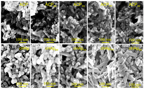Figure 2 shows representative micrographs for the different prepared hydroxyapatite nanoparticles. All the particles were prepared from a first-step precipitation reaction based on the addition of a calcium solution into a phosphate solution (see Section 3.2, Section 3.3 and Section 3.4). In addition, the amorphous (ACP) and crystalline (cHAp) samples were subsequently obtained by aging and thermal treatments, while different STR loading processes were considered. Figure 2 shows representative micrographs for the different prepared hydroxyapatite nanoparticles. All the particles were obtained from a first precipitation step based on the addition of a calcium solution into a phosphate solution (see Section 3.2, Section 3.3 and Section 3.4). In addition, amorphous (ACP) and crystalline (cHAp) samples were subsequently obtained by aging and thermal treatments, respectively, while different STR loading processes were considered. Note that ACP and cHAp correspond to different phases of calcium phosphate, as mentioned in the Introduction. On the other hand, STR was used as a template for particle nucleation due to the positive charge of the amino group (e.g., streptidine domain, Figure 1); consequently different interactions with phosphate and calcium ions were expected. Therefore, STR was loaded together with the calcium solution (cs) or the phosphate solution (ps). Both options represent the incorporation of STR into the mineral structure. The structural incorporation of STR in the early stage of precipitation (rm) is also possible and means the incorporation of STR into crystallites. These structural loading pathways for STR promote binding between the drug and the mineral to prevent drug leakage. By contrast, when the drug is adsorbed (as) onto the mineral, drug leakage can frequently occur.