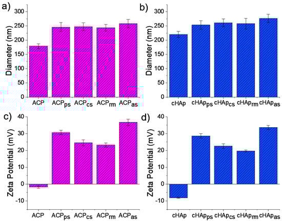 The hydrodynamic sizes of the ACP and cHAp nanoparticles unloaded and loaded with STR are summarized in Figure 3. In general, the DLS measurements indicate that all the studied particles were on the nanometric scale. The unloaded ACP nanoparticles featured the smallest sizes, with an effective diameter of 179 ± 30 nm, while the cHAp nanoparticles featured a greater effective diameter (i.e., 220 ± 38 nm). When the nanoparticles were loaded during synthesis, the effective diameter was increased and values close to 250 nm were determined independently of the type of particle and loading method. A significant increase was detected after adsorption, however; this increase was significantly higher for the cHApas particles (i.e., 258 ± 47 nm and 276 ± 51 nm for ACPas and cHApas, respectively) (Figure 3a,b).