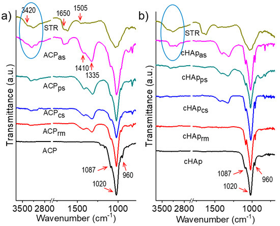 These parameters were lower for the STR-loaded nanoparticles, suggesting some kind of interaction, as also suggested by the FTIR spectra (Figure 4), which could affect both the nucleation and the crystal growth rate. Note that STR features -OH and –NH groups in its streptodine (inositol with guanido groups) and streptoscamine (N-methyl-L-glucosamine) rings (Figure 1) that can form new hydrogen bonds and affect the structure and stability of both ACP and cHAp nanoparticles. This structural alteration was significantly higher when STR was added to the outer part of the nanoparticles before performing the aging and hydrothermal treatments. The adsorption process also influenced the final crystallinity and morphology, as indicated above.