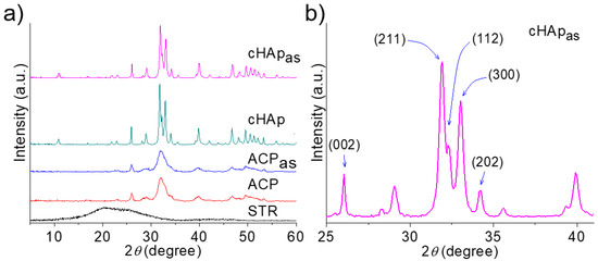 X-ray diffractograms of unloaded and STR-loaded nanoparticles and STR as a control (a). Indexed Bragg peaks for the cHApas sample (b).