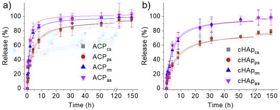 The functional characterization of the synthesized nanoparticles was carried out by studying the release of the STR antibiotic (Figure 6). The results indicate that STR could be effectively released from both ACP and cHAp nanoparticles, although in all cases, the release rate was slower for the cHAp than for the ACP. On the other hand, the release rate was significantly slower for the nanoparticles when STR was loaded in the calcium and phosphate solutions. In these cases, STR could be incorporated in the inner parts of the nanoparticles and, therefore, the release was delayed and a regulating effect was achieved. The faster STR release for the loaded nanoparticles at the end of synthesis (ACPrm and cHAprm) and by adsorption (ACPas and cHApas) was attributed to the diffusion of the STR superficially encapsulated/adsorbed in the nanoparticles.
