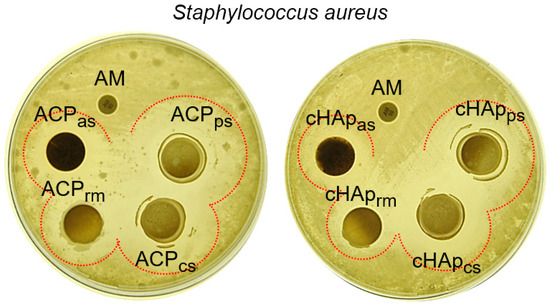 The antibacterial activity of the loaded STR was tested against Staphylococcus aureus as a representative Gram-positive bacteria. Figure 7 shows the inhibition halos achieved with the differently loaded ACP and cHAp nanoparticles. It should be noted that the antibiotic ampicillin (an β-lactam antibiotic that was selected as a “negative control”) rendered a practically negligible halo due to the resistance of the S. aureus strain used in the assay. By contrast, this strain was highly susceptible to STR. However, both kinds of nanoparticles showed a higher inhibition, especially when STR was loaded from the phosphate (ACPps and cHApps) and calcium (ACPcs and cHApcs) solutions. The lowest inhibition occurred when STR was loaded once a former mineral nucleus was obtained (e.g., when the STR was loaded immediately after the precipitation reaction). These results fit well with the lower STR load in this sample (Table 1). The relatively low effect observed with the STR-adsorbed samples seems contradictory considering both their higher pay load and their fast release. STR is an aminoglycoside antibiotic that contains cyclitol moieties, to which amino sugars are covalently linked through glycosidic bonds (Figure 1). These compounds are sensible to several biochemical reactions, including oxidation, reduction, hydrolysis and hydration [38]. Therefore, the STR adsorbed in the nanoparticles (ACPas and cHApas) can easily be biochemically altered (e.g., note the black color of the disk in the plate) leading to reduced antibacterial activity.