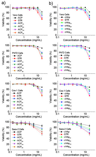 The cytotoxic effect was assessed by means of examining the activity of the extracts prepared from both ACP and cHAp nanoparticles. The cytotoxic activity was examined via MTT assay against selected cell lines, namely Vero, PNT2, Cos-1 and Saos-2 cells (Figure 8). The results revealed that nanoparticle extracts at high concentration (e.g., 20 mg/mL) exert significant cytotoxic effects against the tested cell lines. The results clearly indicated that epithelial (Vero, PNT2, Saos-2) and fibroblast (Cos-1) cells were susceptible to highly concentrated nanoparticle extracts. In addition, no selectivity of the extract was observed against normal cell lines (Vero) and both cancer cells (Saos-2) and immortalized cells with SV40 (PNT2, Cos-1). The presence of STR in the extracts (as revealed by drug release and antibacterial experiments) may account for the observed cytotoxic properties. In this way, STR was used as a positive control in the experiments. Note that the historical development of the prophylactic use of STR as an antibiotic in cell culture as well as its effects on cells, has been reported [39]. The influence of STR on cell morphology, cellular degeneration, cellular function and cell death occurs because the protein synthesis is impaired. This feature can cause interference with, or even changes in, metabolic processes. Although STR and penicillin are widely used antibiotics under standardized conditions in cell cultures due to their low cytotoxicity, it should be considered that the cytotoxic behavior depends on the type of cell. In this way, low cytotoxicity is observed for leukocytes and macrophages, but a rather high cytotoxicity can be found in the case of fibroblasts [40].