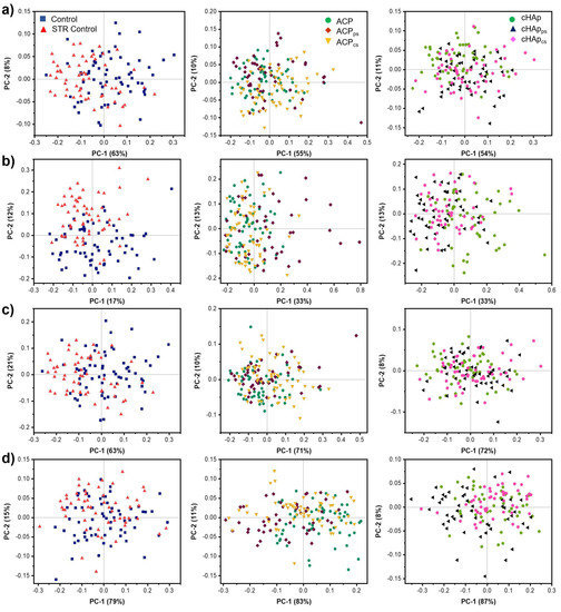 However, the cluster separation of the cells treated with hydroxyapatite and STR-loaded hydroxyapatite nanoparticles was more complex, particularly for cHAp nanoparticles. By contrast, the ACP nanoparticles presented clear evidence of the separation of some clusters when STR was loaded in the Ca2+ and in the (PO4)3− components of the nanoparticle.