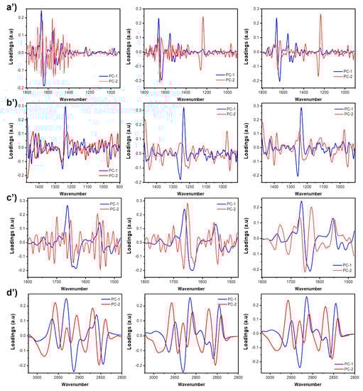 Principal component analysis (PCA) score plots (a–d) and loading plots (a’–d’) from 2nd derivative spectra of groups of treated Saos-2 cells. Biochemical changes from each biochemical group were discriminated considering the PC1 versus PC2 score plot: (a,a’) fingerprint, (b,b’) DNA and glucids, (c,c’) proteins and (d,d’) lipids.