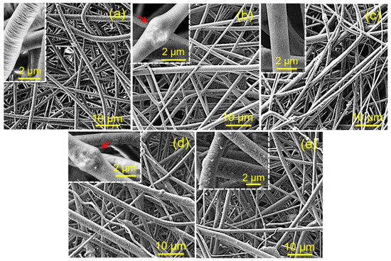 SEM micrographs of electrospun PLA fibers (a), PLA/ACP (b), PLA/ACPps (c), PLA/cHAp (d), PLA/cHApps (e). Nanoparticles aggregates are pointed out with yellow arrows. Insets show magnified images. Arrows show nanoparticles aggregates.