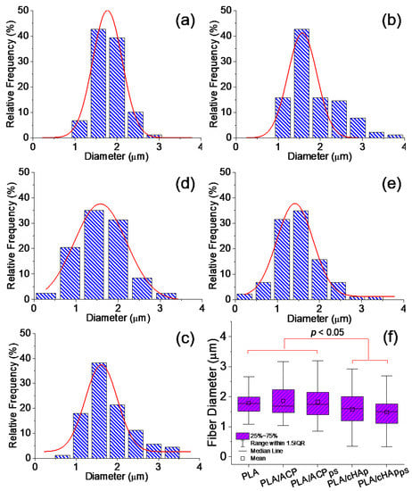 Distribution of fiber diameters for electrospun PLA fibers (a), PLA/ACP (b), PLA/ACPps (c), PLA/cHAp (d), PLA/cHApps (e). Box plot for fiber diameter measurements (f); p < 0.05 by ANOVA-Tukey test.