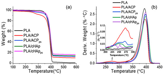 TGA (a) and DTGA (b) curves for PLA scaffolds incorporating unloaded and STR-loaded nanoparticles of amorphous ACP and crystalline cHAp hydroxyapatite.