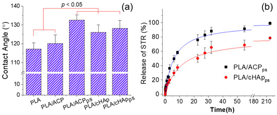 The surface properties of the different PLA scaffolds were evaluated by measuring the contact angles of the water drops (Figure 13a). The results demonstrate that the contact angle of the fibers containing the nanoparticles loaded with the hydrophobic STR (i.e., PLA/ACPps and PLA/cHApps) significantly increased (i.e., from 120–126° to 128–132°). Furthermore, the incorporation of nanoparticles slightly increased the contact angle of the neat PLA matrix (i.e., from 117° to 120–126°). This change may have been a consequence of the protuberances caused by the agglomeration of the nanoparticles, which were more abundant in the ACP-derived matrices (i.e., contact angle of 126°).
