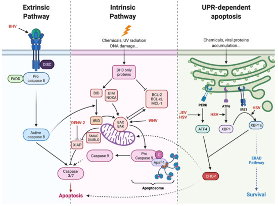 The different pathways of apoptosis. Apoptosis can follow several pathways, depending on the signals integrated by the cell and the respective influence of the mobilized pro- and anti-apoptotic factors. The extrinsic pathway is induced by external death signals such as TNFα and mediated by death receptors (FAS, DR4 expressed on the cell surface. The intrinsic pathway is induced by internal stimuli such as DNA damage, oxidative stress, or intracellular parasites. Apoptosis could also be activated by unresolved endoplasmic reticulum stress (ER stress) and unfolded protein response (UPR) through C/EBP HOmologous Protein (CHOP) [15,16,17,18,19,20,21,22]. Viruses such as BHV, DENV, WNV, JEV, and HSV (in red) can induce apoptosis by the activation of different pathways [23,24,25,26,27,28,29,30,31,32,33,34,35].