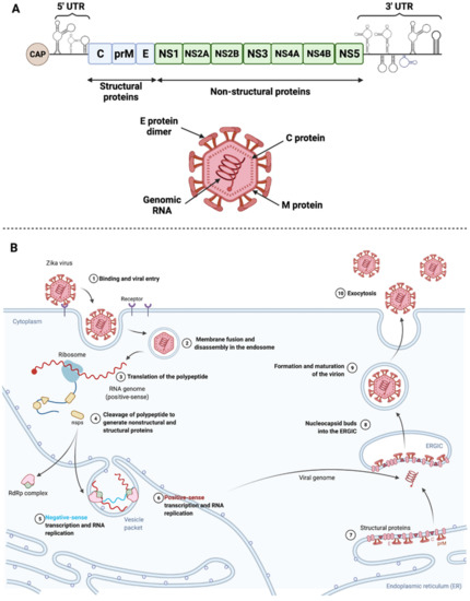 Zika virus structure and life cycle. (A) Scheme of Zika virus genome and structure. Zika virus genome encodes 10 viral proteins, three structural, and seven non-structural. 5′ and 3′ UTR refer to untranslated regions [65]. (B) ZIKV binds its specific receptors and is subsequently internalized into the target cell via clathrin-mediated endocytosis (1). Viral RNA is released into the cytoplasm following virus fusion with the endosomal membrane and capsid disassembly (2). Upon release, positive-sense RNA is translated into a polypeptide incorporated in the endoplasmic reticulum (ER) membrane and cleaved by proteases into structural and non-structural proteins (3,4). It will also be transcribed into negative-sense RNA that will serve as a template for RNA replication that takes place in ER vesicle packets (5,6). Viral proteins are accumulated and structured at the level of the ER (7). Virus assembly, budding, and maturation then occur in the ER-Golgi intermediate compartment (ERGIC) and in the Golgi apparatus, respectively (8,9). New viruses are released by exocytosis (10). Adapted from Lebeau et al. [66].