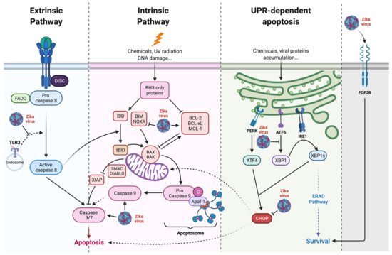 Zika virus controls apoptosis. ZIKV acts on anti-apoptotic factors such as Bcl-2 or Bcl-xL mainly through an effect mediated by the non-structural proteins. ZIKV controls CHOP activity during UPR, limiting its pro-apoptotic activity [92]. DsRNA/TLR3 induced apoptosis is controlled by ZIKV through NS2B/3 [82]. ZIKV also stimulates the expression of pro survival factors such as fibroblast growth factor 2 (FGF2) [88,93].