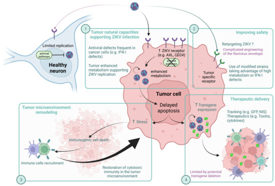 Interestingly, ZIKV has been considered as an oncolytic candidate, notably for therapy of brain cancer [150]. The modes of action of ZIKV on the tumor and the advantages and disadvantages of using this virus, which may be genetically modified, are summarized in Figure 4. Briefly, oncolytic viruses are replicative viruses capable of specific replication in cancer cells. These biological agents have cancer therapeutics potential due to their ability to induce selective tumor cell death through direct cytopathic effects. They induce an immunogenic cell death similar to apoptosis, which releases cell debris and viral antigens. Dendritic cells from the microenvironment will then allow the immune system to be educated against the tumor [151,152]. Countering the frequent immune escape phenomena induced by the tumor microenvironment is therefore one of the major goals of new anti-cancer therapies. Showing the important potential of this type of treatment, the FDA already approved the use of Talimogene Laherparepvec (T-VEC), a modified herpes simplex virus type I, for metastatic melanoma management [151].