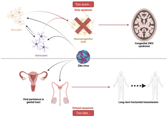 In the case of ZIKV infection and pathogenesis, massive apoptosis of neuronal progenitor cells (NPCs), early in fetal development, has been proposed as an explanation for the specific induced central nervous system (CNS) disorders in newborns and infants [8,9]. At the same time, the finding that ZIKV can persist in adults in the urinary and reproductive tracts and semen, for many months after the acute infection episode, is an indication that viral clearance may be incomplete and associated with impaired or delayed apoptosis [10].