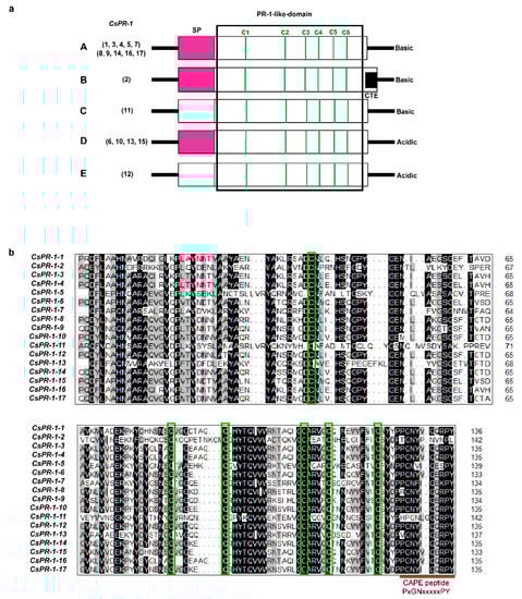According to the calculated pI values, the predicted signal peptide (SP), and the C-terminal extension (CTE) of the deduced proteins, the 17 CsPR-1 genes were classified into five major groups (Figure 1a). Group A included 10 genes (CsPR-1-1, -3, -4, -5, -7, -8, -9, -14, -16, and -17), which all encoded basic (pI = 7.08-9.17) PR-1 proteins containing an N-terminal SP and a PR-1 like domain of 134 aa to 139 aa. Group B included only CsPR-1-2, which encoded basic (pI = 10.64) protein containing an SP and a PR-1-like domain of 142 aa, followed by a CTE. Group C was comprised of CsPR-1-11, encoded basic (pI = 9.13) protein with a PR-1-like domain of 141 aa. Group D included four genes (CsPR-1-6, -10, -13, -14, and -15), which all encoded basic (pI = 4.75–6.49) proteins containing an SP, followed by a conserved PR-1like domain of 133 aa to 137 aa. Group E (CsPR-1-12) encoded a basic (pI = 5.07) protein containing a PR-1 like domain of 135 aa. The amino-acid sequences of the PR-1-like domain of the 17 deduced CsPR-1 proteins were aligned. Most CsPR-1 proteins have three strictly conserved cysteine-residue pairs and a CAPE 1 peptide (Figure 1b).