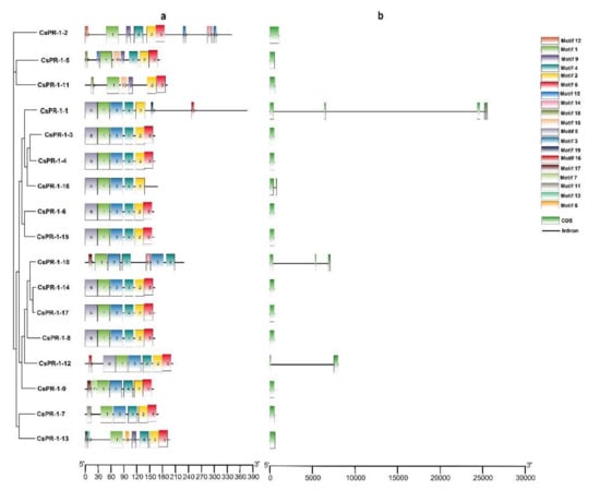 Phylogenetic clustering, motif compositions, and gene structures of the CsPR-1 family members in tea plants. (a) The motifs of each CsPR-1, as well as 20 different motifs, are represented by different colored boxes. (b) Exon-intron structural analyses of CsPR-1.