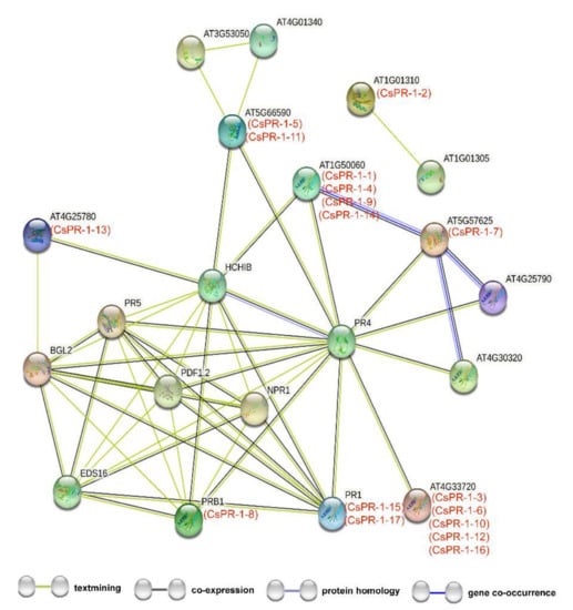 Functional interaction networks of the CsPR-1 proteins were constructed using STRING software on the basis of the homologous proteins in Arabidopsis (Table S3). The results show that the 17 CsPR-1 proteins participated in the interaction network, indicating a universal and complex interaction of CsPR-1 proteins (Figure 3). Most CsPR-1 proteins were involved in the SA-signaling pathway or JA/ET-signaling pathway by interacting with NPR1, EDS16, BGL2, PR4, and HCHIB. CsPR-1-12 was independent.
