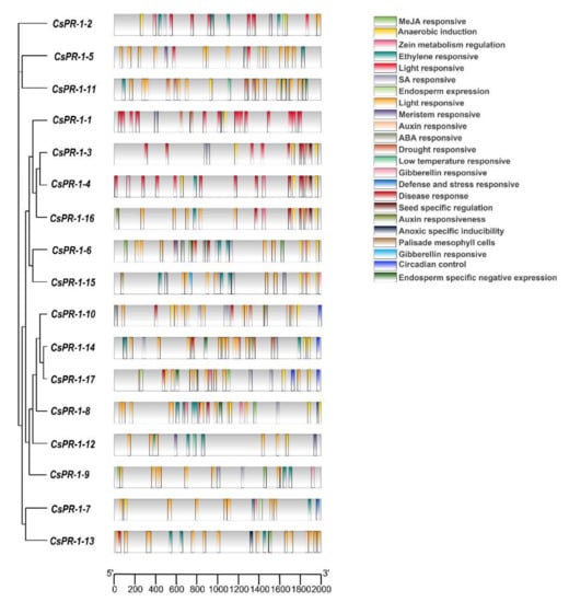 The cis element in the CsPR-1 promoters were analyzed using Plant CARE. The results show many hormone-response elements, biological stress-response elements, and abiotic stress-response elements in the CsPR-1 promoters (Figure 4). Various response-hormone elements, such as SA (TCA-element, as-1), Me-JA (TGACG-motif, CGTCA-motif), ABA (ABRE), GA (P-box, GARE-motif), ET (ERE), and IAA (TGA-element, AuxRR-core) were present. These hormones, especially SA and JA, are closely related to the resistance. SA and JA cis elements were present in the promoters of CsPR-1-1, -2, -3, -4, -5, -6, -7, -8, -9, -10, -13, -14, -15, and -17 genes, and JA cis elements were present in CsPR-1-2, -5, -6, -8, -9, -10, -13, -14, -15, and -17. Flavonoid biosynthesis (MBSI) and W-box elements were also found in the deduced CsPR-1 promoter, closely related to the response to fungal stress. In addition, cis -acting elements, in response to light (i.e., I-box, Box 4, G-box, GT1-motif, Box II, TCT motif, and L-box), low temperature (LTR), drought (MBS), anaerobic stress (ARE), and meristem (CAT-box) also exist in the promoter region of CsPR-1 family genes.