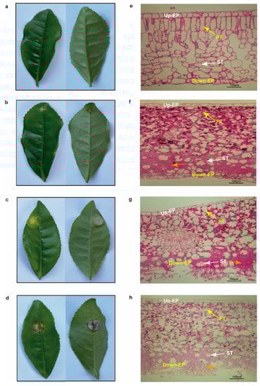 Observation of the stages and PAS staining of tea leaves. Healthy leaves (a,e) and tea leaves infected with tea blister blight at the different stages of infection: early stage (b,f), middle stage (c,g), and late stage (d,h). The orange arrow represents club-shaped hyphae structures of Exobasidium vexans. Up-EP: up-epidermis; Down-EP: down-epidermis; PT: palisade tissue; ST: spongy tissue. Bar = 100 μm.