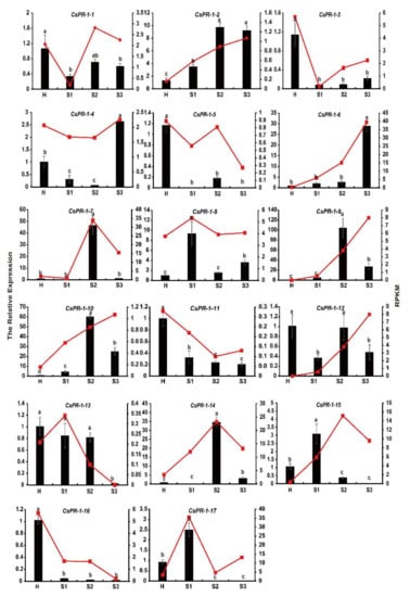Comparison of the transcript expression results from the RNA-seq and qRT-PCR analysis of the CsPR-1 family genes under tea blister-blight disease stress. The relative expression of genes validated using qRT-PCR (bar chart, left ordinate) and the fragments per kilobase of transcript per million mapped reads obtained from transcriptome sequencing (line diagram, right ordinate).