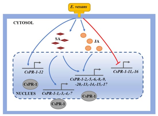 Proposed model of CsPR-1-modulated blister blight in tea plants. The blue arrow indicates the upregulation of genes; the red arrow indicates the downregulation of genes.