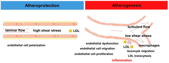 The modern concept of vascular hemodynamics assumes that in the straight parts of arteries the blood flow has a laminar character in which blood moves in orderly layers with a minimum velocity along the vascular wall and a maximum at the geometric center of the vessel. This corresponds to high values of shear stress, i.e., the frictional force that the blood exerts on the vascular wall [92]. This nature of blood flow is considered atheroprotective. In contrast, in the area of curvatures or bifurcations the blood flow has a turbulent character and low shear stress values correspond to it. Areas of arteries that are subject to turbulent blood flow are associated with the development of atherosclerosis. Shear stress is one of the key hemodynamic determinants of endothelial function [93]. Shear stress greater than 15 dyne/cm2 has been shown to contribute to an atheroprotective gene expression profile of endothelial cells, with low shear stress (<4 dyne/cm2) observed in arterial sites prone to atherosclerosis [94] (Figure 1).
