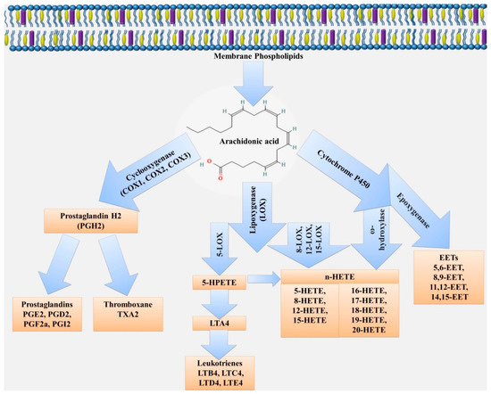 Arachidonic acid can be metabolized by three major enzymatic pathways: COX, lipoxygenase (LOX) and CYP. The enzymatic conversions produce a variety of different, and sometimes opposing, products in function and activity [168,169]. These metabolites may affect the function of both endothelial and other cells in the vascular wall. For example, the COX pathway converts arachidonic acid to produce prostaglandins (PGE2, PGF2, PGD2), thromboxane (TXA2) and prostacyclin (PGI2). The lipoxygenase pathway promotes the formation of LT, lipoxins, resolvins and other metabolites [18,170,171,172]. CYP enzymes contribute to the formation of hydroxyeicosatetraenoic acids (16-, 17-, 18-, 19- and 20-HETE) and epoxyeicosatrienoic acids (EETs; 5,6-EET, 8,9-EET, 11,12-EET and 14,15-EET) (Figure 2).