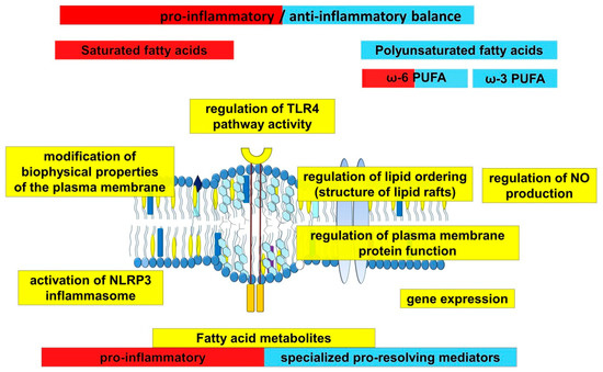 Saturated fatty acids are thought to be associated with proinflammatory effects, which are provided by modifying the structure of the plasma membrane of cells, direct stimulation of proinflammatory signaling pathways. At the same time, PUFAs demonstrate a more complex role in inflammation. Accumulating evidence suggests a different contribution of ω-3 and ω-6 PUFAs to inflammation [16].