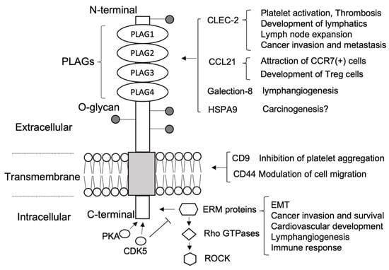 Podoplanin consists of an extracellular domain of approximately 130 amino acids, a transmembrane domain of approximately 25 amino acids, and a short intracellular domain of approximately 10 amino acids [14]. A schematic overview of the structure of podoplanin and its binding partners is shown in Figure 1.