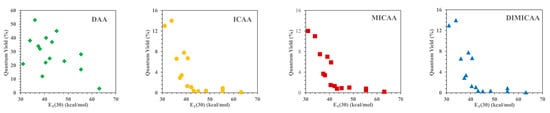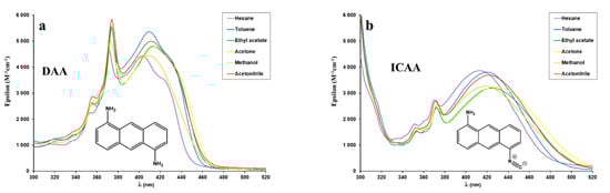 Interestingly, two groups can be identified: one belonging to the diamine (DAA) and the other to the isocyano (ICAA-DIMICAA) dyes (Figure 6a). In both cases, the correlation is linear between the fluorescence emission maximum and ET(30) for all the anthracene fluorophores. It can be surmised from the corresponding slopes that ICAA, MICAA and DIMICAA have almost the same solvatochromic shift (113–120 kcal−1cm−1mol), while this value is significantly lower for the 1,5-DAA (77 kcal−1cm−1mol) supporting the ICT character of the emission state of ICAA-DIMICAA, which is in good agreement with the computational findings presented in Table 2. It should be noted, however, that because of their strong H-bond donating character (i.e., the solvatochromic response is strongly modulated by specific interactions), protic solvents (iPrOH, MeOH and H2O) were not included in the plot. The plots containing all the solvents are found in the Supplementary Information (Figure S89).