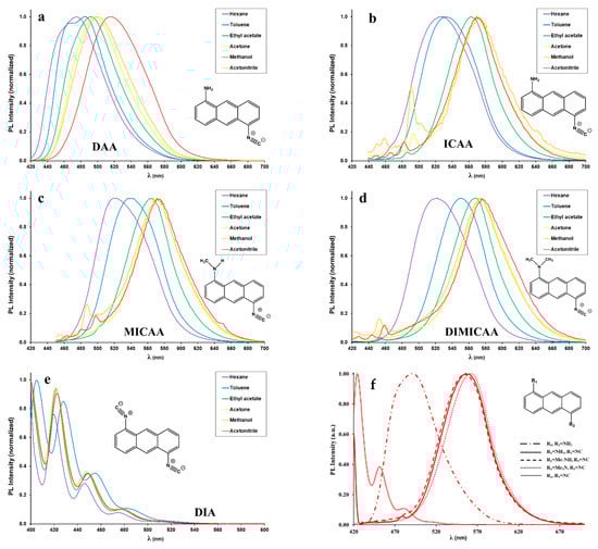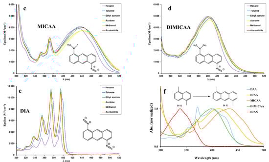 UV–vis spectra of 1,5-diaminoanthracene and the isocyano derivatives recorded in solvents of different polarity (a–e). The normalized UV–vis spectra (f) of DAA-DIMICAA in hexane in comparison to 1-amino-5-isocyanonaphthalene (ICAN). ([dye] = 5 × 10−5 M, T = 20 °C).